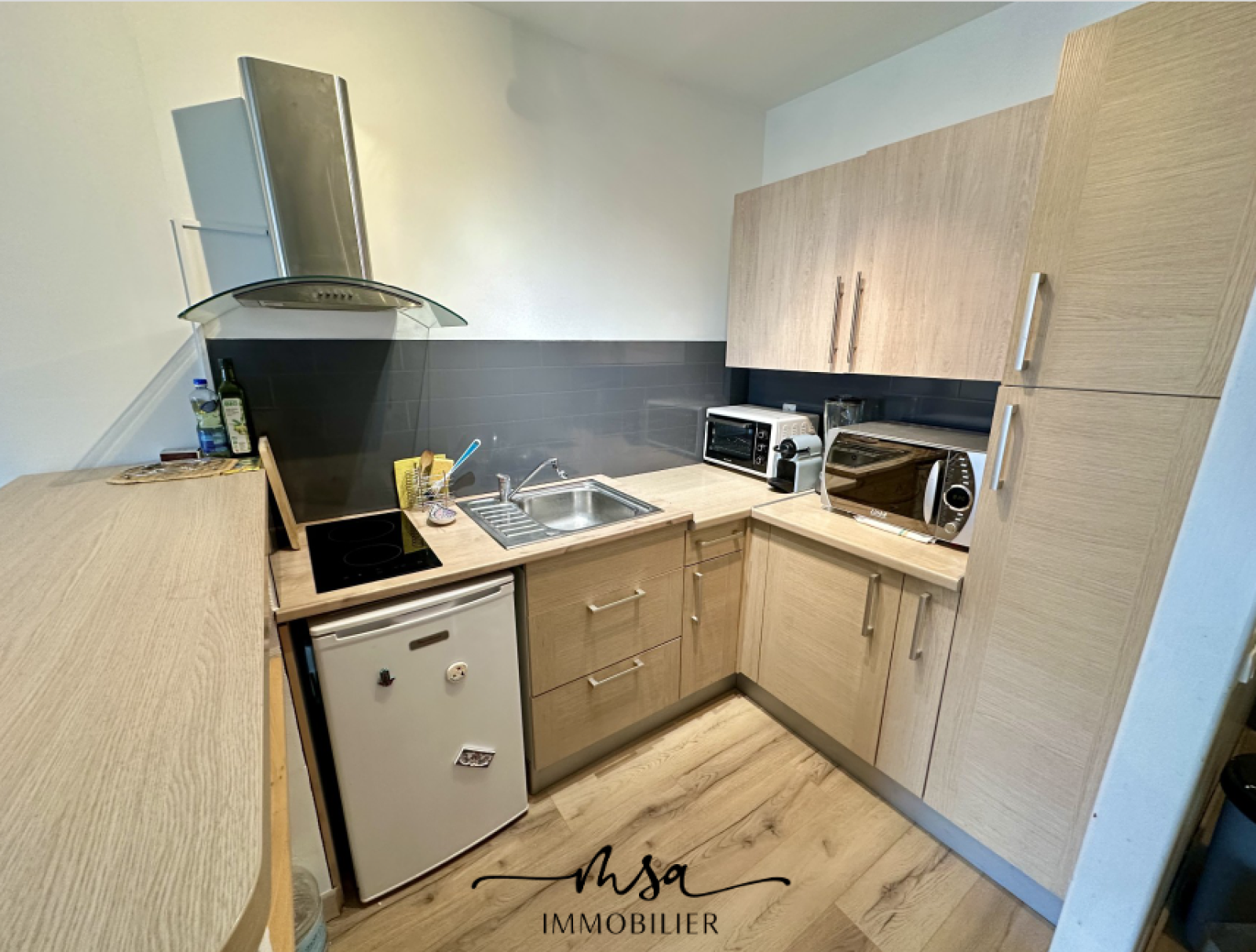 Il comprend : Une entrée, un séjour lumineux donnant accès à une cuisine américaine équipée et aménagée (frigo, plaques de cuisson, four et micro-ondes), avec un accès à un balcon exposée plein sud.